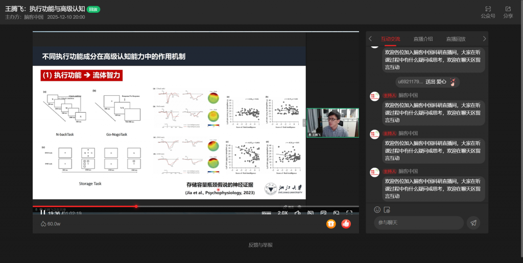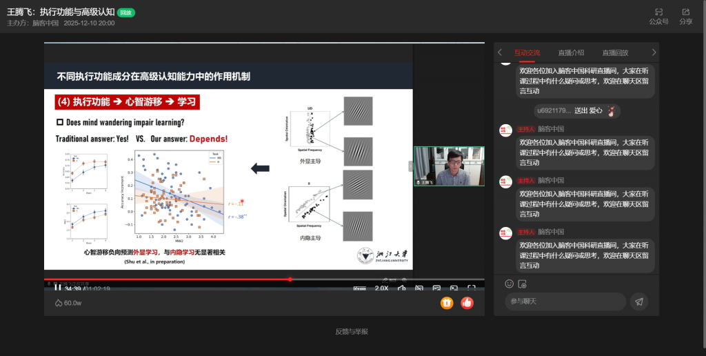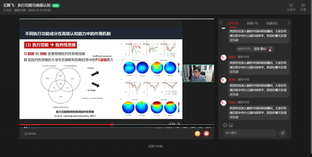 12月10日,浙江大学王腾飞教授做客“脑客中国・科研直播”,以“执行功能与高级认知”为主题,按“执行功能与高级认知、执行功能的正常开展、执行功能的异常开展”三部分展开分享,深度解析执行功能的核心机制与实践价值。
