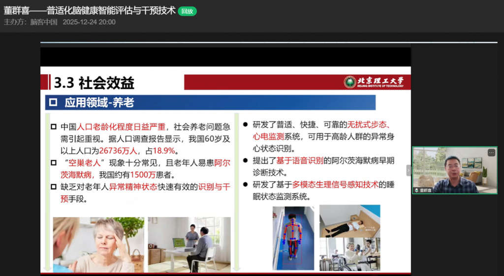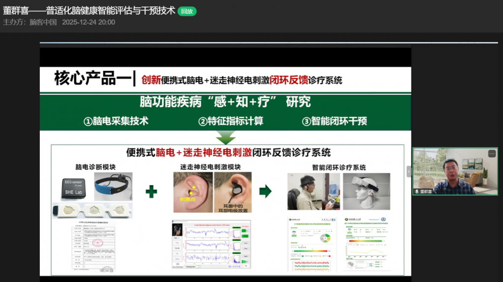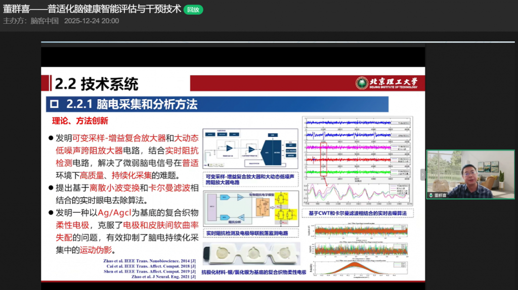 12月24日,在脑客中国直播间,北京理工大学董群喜教授带来以“普适化脑健康智能评估与干预技术”为主题的精彩分享,从背景简介、研究内容到产业落地,全方位拆解脑健康领域的创新突破与应用实践,为观众呈现了一场兼具学术深度与产业价值的知识盛宴。